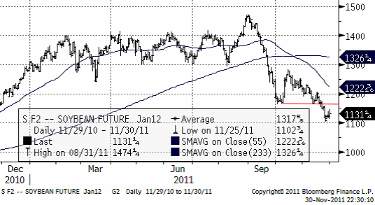 Priset på sojabönor befinner sig i en sjunkande trend. Det är en ”bear market”. Denna förstärktes för ett par dagar sedan när det tekniska stödet på 1167 bröts. Priset kan mycket väl gå ner mot 10 dollar.
