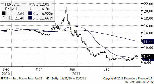 Nedan ser vi kursdiagrammet på europeisk potatis, som handlas på Eurex; terminen avser leverans april nästa år.