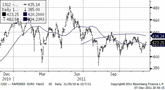 StatCan rapporterar att produktionen av raps (canola) slog nytt rekord under 2011 enligt deras sista prognos för året. Prognosen är 14.2 mt, en höjning sedan senast från 12.9 mt. Förra årets skörd var 12.8 mt.