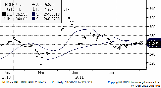 Terminspriset på Matif-vete (mars) har handlats i spannet 174.75 eur – 179.00 eur sedan förra veckan. Viss fundamenta har angett riktning för priset men marknaden påverkas också i nuläget av den oro som råder över den ekonomiska krisen i Europa. Aktiviteten har dock varit låg i avvaktan på fredagens WASDE rapport och utgången av EU-toppmötet.