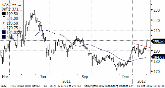 Nedan ser vi novemberkontraktet, som inte bröt ur sin konsolidering i tisdags morse, men som ännu inte nått motståndsnivån på 205 euro.