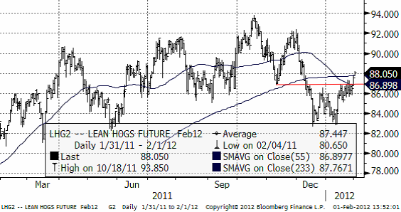 Priset på lean hogs har brutit uppåt, och befinner sig därmed fortfarande i det breda intervall som priset pendlat inom det senaste året.