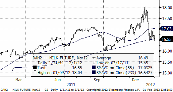Nedan ser vi priset på marskontraktet på flytande mjölk (kontakt avräknat mot USDA:s prisindex). Vi tror fortfarande att priset kan gå ner till 16 och att prisnedgången är ”halvvägs”.