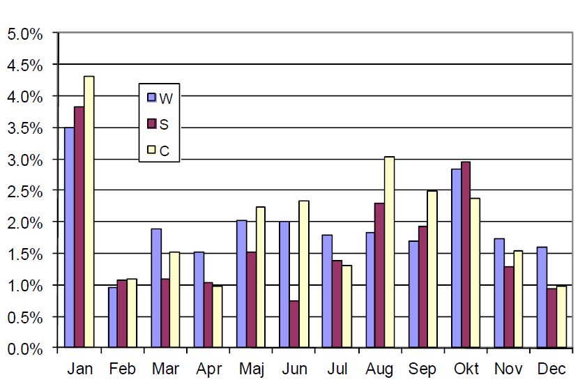 Genomsnittlig prisrörelse på WASDE-rapporteringsdagar sedan 2002 (10 år):