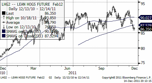 Priset på lean hogs har fallit stadigt den senaste veckan, men priset ligger ännu inom det breda prisintervall som etablerades under senvåren. 85 cent torde utgöra ett stöd, såsom botten på prisintervallet.