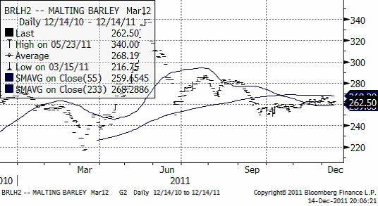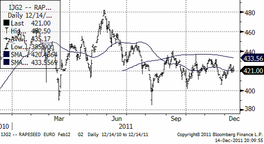 I detta det sista veckobrevet för 2011 om marknaderna för jordbruksprodukter kan vi summera året. Det senaste året har priset på kvarnvete sjunkit med 23%, rapsfrö med 12%. Mjölkpriset har stigit med 35% och urea med 52%. Tack vare gynnsamt väder har priset på potatis fallit med 71% på Eurexbörsen i Frankfurt. Dollarn är upp med 3% mot svenska kronor och euron är oförändrad, faktiskt.
