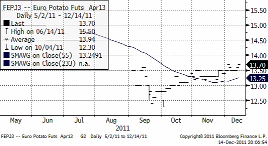 Priset på potatis av årets skörd fortsatte stiga i veckan, ännu en vecka. Rapporten kom från Jordbruksverket tidigare i veckan om en betydligt högre skörd av matpotatis i Sverige, men informationen nådde alltså marknaden redan på försommaren, när priserna började falla. Nedan ser vi kursdiagrammet på europeisk potatis, som handlas på Eurex; terminen avser leverans april 2012.