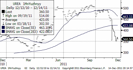 Nedan ser vi 1 månads terminspris på Urea fob Uyzhnyy. Priset har fallit kraftigt under hösten.