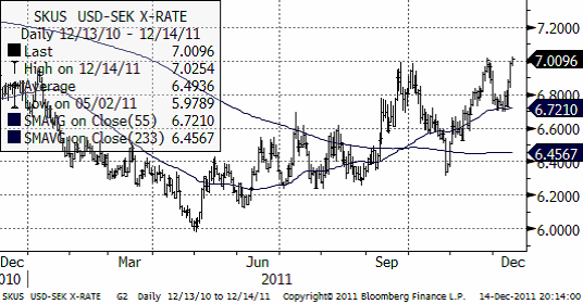USDSEK har en stigande trend och har nått upp till heltalet 7 kr per dollar. Växelkursen har vänt ner därifrån två gånger tidigare och frågan är nu om kursen ska orka ta sig igenom den här gången.