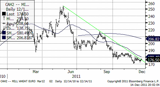 Terminspriset på Matif-vete (mars) ligger i en stadig trend nedåt.