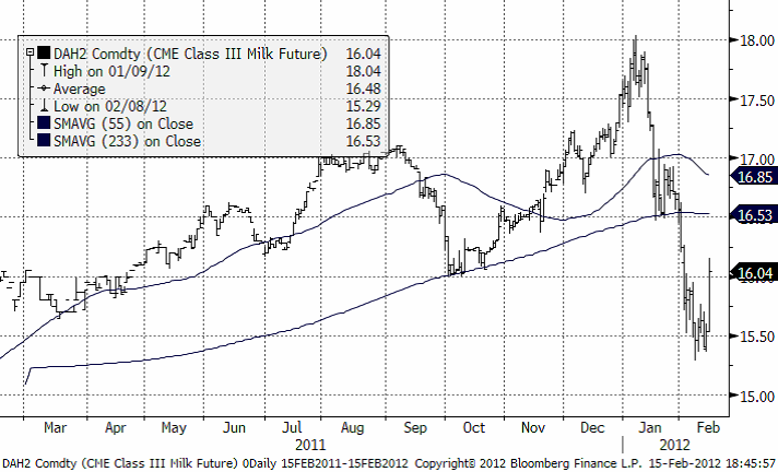Nedan ser vi priset på marskontraktet på flytande mjölk (kontakt avräknat mot USDA:s prisindex). Priset har som vi ser fallit kraftigt i februari.