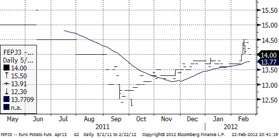 Priset på industripotatis steg upp till 14.50 euro för leverans i april 2013, men rekylerade sedan ner till 14 euro per deciton. Pristrenden är uppåtriktad.