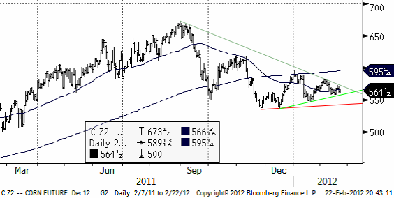 Nedan ser vi decemberkontraktet på majs på CBOT, där priserna bildat en klassisk ”triangelformation”. När priserna lämnar den, brukar detta vara starten på en större kursrörelse. Vi har trott och tror på fallande priser, men vill inte ta några positioner just nu, utan vill avvakta utbrottet ur triangeln. I synnerhet Kinas efterfrågan är ett stort frågetecken.