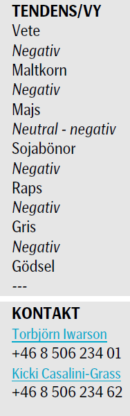 Informationen väntas allmänt av marknaden att vara ”bearish” för spannmål. Enligt USDA väntas amerikanska bönder så mest majs sedan 1944. Mer finns att läsa på Bloomberg.