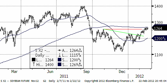 Sojabönorna gynnas av att vädret i Sydamerika har stabiliserats, eller rättare sagt, priset missgynnas. Priset har segat sig upp, efter att ha brutit en motståndslinje (den gröna i diagrammet nedan), men har inte på ett övertygande sätt gått över den röda motståndslinjen i diagrammet. Uppgången har förlorat momentum de senaste dagarna och det skulle kunna förebåda en kortsiktig rekyl nedåt.