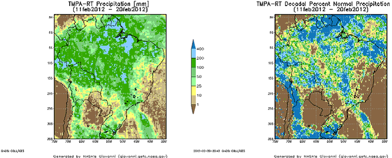 Sydamerikas väderleksprognos visar idag nära normal nederbörd i norra Argentina, Paraguay och södra Brasilien. Södra Argentina och centrala och norra Brasilien är torrare. I Sao Paulo är det smällhett och det har inte regnat på länge. Karnevalen slutade i lördags. Nedan ser vi två satellitbilder på nederbörden över södra Brasilien och norra Argentina för tiodagarsperioden 11 februari och 20 februari. Till vänster ser vi nederbörden och till höger avvikelse från normal nederbörd.
