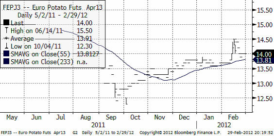 Kommissionen uppskattar att årets veteskörd kommer att uppgå till strax under 133 mt, vilket är en ökning med ca 3.2 mt jämfört med 2011 och bygger på en förväntad avkastning om 5.7 ton per hektar, vilket skulle vara högre än genomsnittet och det bästa resultatet på fyra år, trots en eventuell påverkan av köldknäppen tidigare den här månaden. En ökad sådd areal om 133 000 hektar borde också göra sitt till och den totala arealen för vete förväntas uppgå till 23.3 m hektar, vilket är mer än de estimerade 23.0 m hektar från den franska analysfirman Strategie Grains för två veckor sedan.