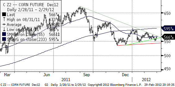 Nedan ser vi decemberkontraktet på majs på CBOT, där priserna bildat en klassisk ”triangelformation”. Vi skrev om detta redan förra veckan, men något utbrott har ännu inte inträffat – bortsett från ett falskt utbrott på nedsidan. Ett falskt utbrott brukar följas av en ordentlig rörelse åt andra hållet. Det återstår att se, men ett brott uppåt måste tas på allvar. Vi får ha en neutral rekommendation för tillfället.
