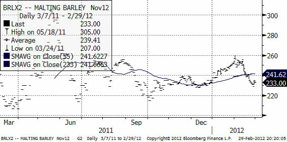 Novemberkontraktet på maltkorn har handlats ner 1.25 euro sedan förra veckans brev. Vi finner inga specifika nyheter.