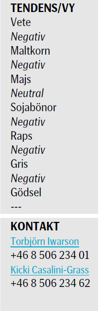 Från Kina har kommit prognoser på en 46 mt lägre spannmålsskörd jämfört med förra årets rekord på 571 mt. Det har också talats om att använda vete som foder där. Kina är ett observandum, men annars bör det bli en press nedåt på vetepriset i världen framöver.