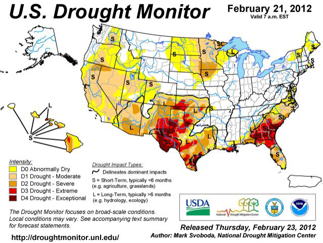 USA är som bekant torkdrabbat på grund av La Niña. Nedan ser vi ”US Drought Monitor”. Om det är någon gröda som råkat värst ut, så är det bomull. Det är rött både i det som kallas för ”Prairie Gateway” (västra Texas och uppåt) och ”Southern Seaboard” (norr om Florida).