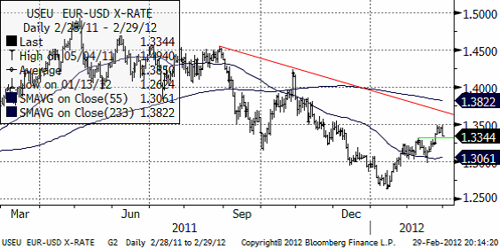 Euron steg mot dollarn, men efter ECB:s pengatryckeri och Ben Bernankes återhållsamhet föll euron idag, dock inte signifikativt ur ett tekniskt perspektiv.