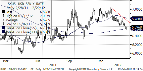 Läget är oförändrat från förra veckan: En ”triangelformation” har bildats sedan mitten av januari. Man bör invänta riktningen på utbrottet från den för att fatta beslut om att köpa eller sälja eursek. 8.70 har tidigare varit ett starkt ”golv” för växelkursen.