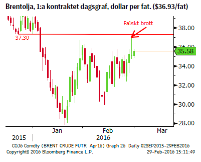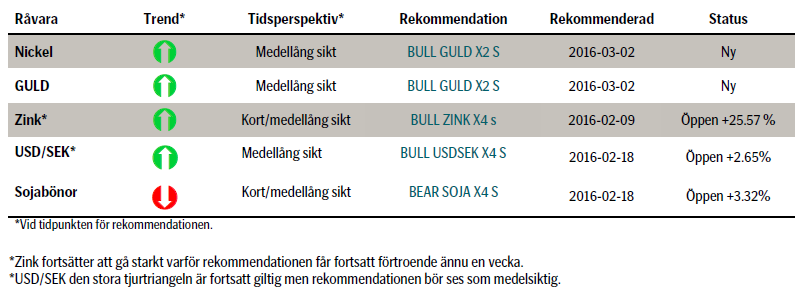 Råvaror: Den bottenformation i zink som vi fick i januari erhöll sin bekräftelse under februari och nickels prisrörelser har skapat ett falskt månadsbrott på nedsidan (=möjlig medelsiktig botten). Oljan var fortsatt volatil men slutade förra veckan med ett falskt uppsidesbrott (möjlig korrektionstopp). Dock pekar månadsgrafen på fortsatt byggande av en mer bestående botten då vi nu fick en andra lång spik på nedsidan (= misslyckade försäljningar). Statistiken visar också att bl.a. hedgefonder i allt större utsträckning tar positiva oljepositioner. Sydafrika sägs planera för en sockerskatt om 20 % för sötade drycker (och de är inte ensamma med den tanken). Skulle förslaget klubbas bör det vara negativt för socker på lite längre sikt.