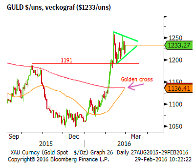 Guldpriset är fortsatt konsoliderande. I och med den senaste veckans utveckling så ser det mer och mer ut som om att vi håller på att skapa en positiv triangel, ett fortsättningsmönster för uppsidan. Artiklar i pressen är också i huvudsak fortsatt positiva till guldet varför intresset för ytterligare köp (från i huvudsak ETF-kunder) bör vara fortsatt starkt.