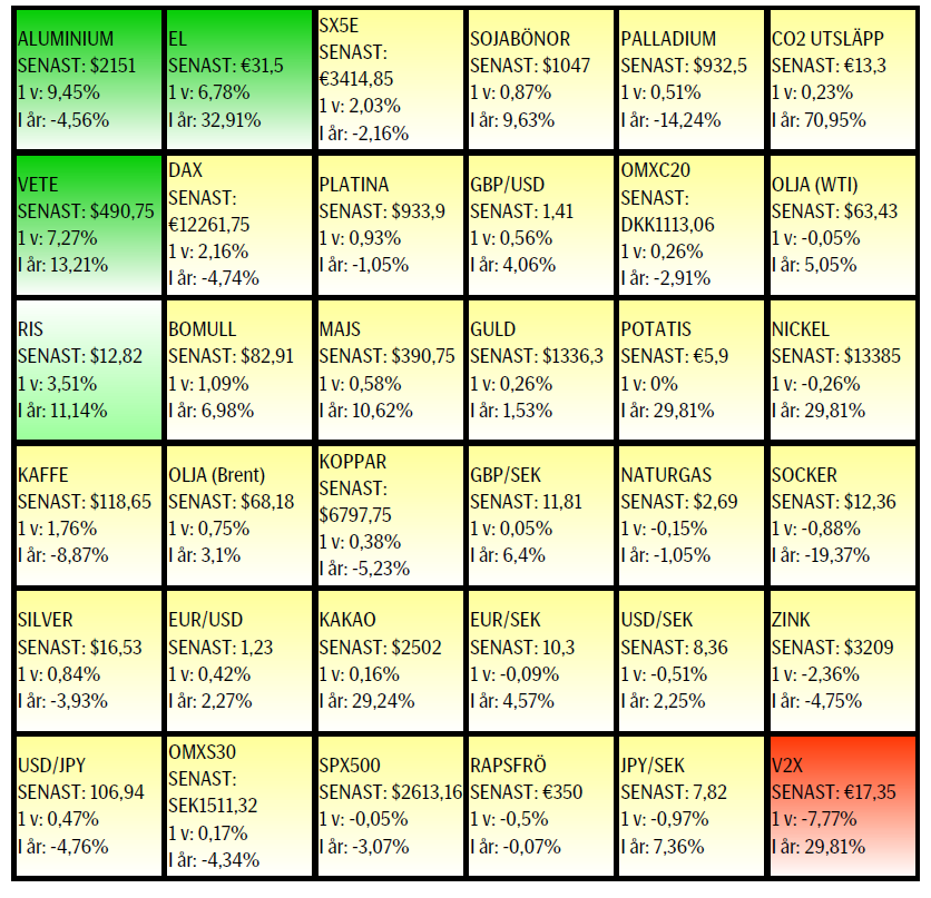 Råvaror: Veckans raket är aluminium som efter amerikanska sanktioner mot flera ryska bolag, däribland Rusal (~13 % av världsproduktionen och den största tillverkaren utanför Kina), en av världens största tillverkare, stigit kraftig. Konsumenterna befarar en bristsituation varför det igår var rena rusningen för att täcka näraliggande inköp. De ökade spänningarna i Syrien lyfter också riskpremien i oljan. Har den amerikanska oljeexporten slagit i taket? Hursomhelst så har vissa områden nu nått kapacitetstaket vad gäller pipelines, resulterandes i att olja från vissa områden nu handlas med stor rabatt. Positivt för oljepriset är också den fortsatta nedgången i produktion i Venezuela, även Kina rapporterade att produktionen fallit. Övriga metaller har mer eller mindre fortsatt att konsolidera. Gällande koppar så har ett viktigt löneavtal tecknats mellan Codelco och gruvarbetarna. Lägre strejkrisk bör vara lätt negativt för koppar då marknaden varit orolig för en besvärlig avtalsmarknad i Chile.
