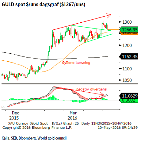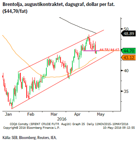 Råvaror: Oljeprisuppgången fortsätter att visa svaghet och förra veckan föll den långa nettopositioneringen för första gången på två månader. Metaller är också på defensiven och vi förväntar oss mer av detsamma. Guld och silver korrigerar också lägre vilket såsmåningom kommer att leda oss till det sedan ett tag utmålade köpområdet. I Shanghai pågår världskonferensen för aluminiumintressenter (9-11 maj). Bl.a. en svag kafferapport från Vietnam har åter satt fart på priset. Riset råkade ut för en kortsiktig och brutal prisnedgång tidigt Asientid måndag morgon (felprissättning?). Vi ligger kvar långa så länge vi är kvar över $10,70/cwt. Även de tidigare så haussade sojabönorna visar nu tecken på mättnad. WASDE rapporten som kommer tisdag kväll har föranlett framför allt försäljningar av majs då statistiken förväntas visa på nya rekordnivåer av lagerhållen majs.