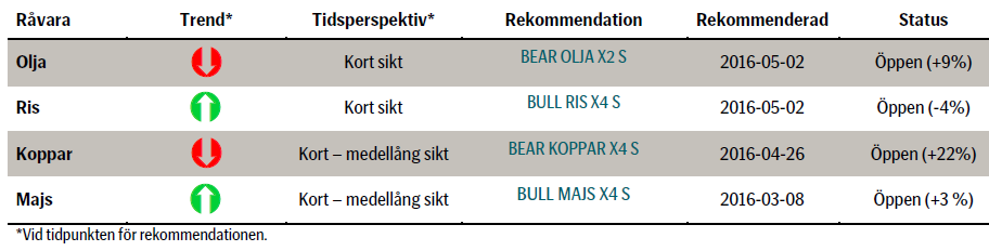 Vår säljrekommendation från den 26/4 har efter lite initial tvekan börjat utveckla sig enligt plan. Det finns flera olika anledningar till utvecklingen men de främsta är de kinesiska myndigheternas försök till att stävja allt för vidlyftiga spekulationer samt den kraftiga lageruppbyggnad som tidigare i år ägt rum.