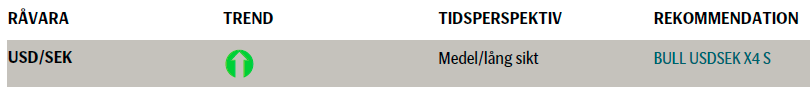 Den vändning som vi förra veckan sökte runt 7,89 ser nu ut att ha materialiserats varför vi tar den medelsiktigt långa position (BULL USDSEK X4 S) vi rekommenderade. Bortstötningen från botten på den mer än årslånga konsolideringen ser mycket lovande ut. USD/SEK för också en extra skjuts då vi förväntar oss att EUR/USD fortsätter att försvagas likväl som EUR/SEK borde fortsätta ytterligare en bit högre. Den som har lite tålamod kan prova att vänta på en mindre rekyl ned mot 8,10 innan nästa uppgångsfas beräknas starta.