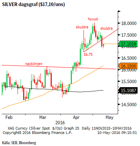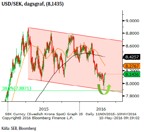 Råvaror: Oljeprisuppgången fortsätter att visa svaghet och förra veckan föll den långa nettopositioneringen för första gången på två månader. Metaller är också på defensiven och vi förväntar oss mer av detsamma. Guld och silver korrigerar också lägre vilket såsmåningom kommer att leda oss till det sedan ett tag utmålade köpområdet. I Shanghai pågår världskonferensen för aluminiumintressenter (9-11 maj). Bl.a. en svag kafferapport från Vietnam har åter satt fart på priset. Riset råkade ut för en kortsiktig och brutal prisnedgång tidigt Asientid måndag morgon (felprissättning?). Vi ligger kvar långa så länge vi är kvar över $10,70/cwt. Även de tidigare så haussade sojabönorna visar nu tecken på mättnad. WASDE rapporten som kommer tisdag kväll har föranlett framför allt försäljningar av majs då statistiken förväntas visa på nya rekordnivåer av lagerhållen majs.
