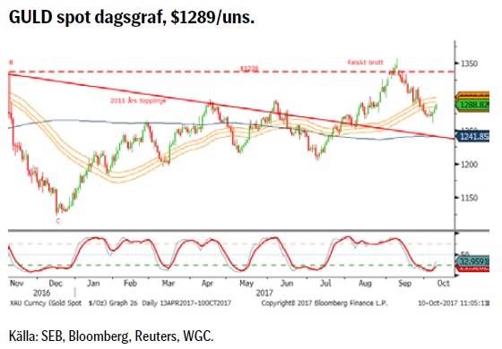 Tills $57.28 bryts kvarstår risken för ytterligare korrektion ned mot $54-området dvs, botten av den sedan i juni stigande kanalen. Den spekulativa långa nettopositionen i Brent har nått en ny rekordnivå, något som kanske kan utgöra en varning om att vi behöver mer konsolidering/korrektion. Uppfyllandegraden hos de OPEC länder som ingår i överenskommelsen fortsatte att falla under september och lägger vi till Nigerias och Libyens produktion (de är exkluderade från överenskommelsen) så landar vi på en neddragning på knappt 500k fpd istället för den ursprungliga 1.2m fpd. Dock är det en positiv signal att trots en lägre grad av neddragning fortsätter lagren att falla.