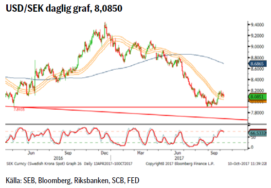 Att orkanerna i USA skulle få följdverkningar på arbetsmarknadsstatistiken kom ju inte som någon överraskning. Dock steg timlönerna något mer än förväntat vilket ytterligare spär på sannolikheten för en nästa räntehöjning om 0,25 % från Fed i december. Osäkerheten över utvecklingen i Katalonien har tryckt ned den spanska börsen och ligger för närvarande lite som en våt filt över eurozonsbanker. En annan lite undanskymd nyhet som jag tror är av stor betydelse är det historiska i besöket i Ryssland av den Saudiska kungen. Många och stora kontrakt signerades och mest remarkabelt kanske försäljningen av ryskt luftvärn (S-400 systemet). Vapenleveranser till Saudiarabien har ju historiskt varit en affär för Västeuropa och framför allt USA. Ett mardrömsscenario för USA. Dessutom ökar detta sannolikheten för att Saudierna och Ryssarna lyckas få till en förlängning av oljeproduktionsbegränsningarna bortom 31 mars nästa år. Det är nu också bara åtta dagar kvar till det Kinesiska Kommunistpartiets 5-års kongress öppnar, där kommer det att sökas ledtrådar om den framtida tillväxttakten, OBOR (One Belt, One Road) samt vilka sektorer som kan tänka gynnas och missgynnas (miljöföroreningar är ett prioriterat område). Senast den 15:e oktober måste President Trump avgöra om kärnavtalet med Iran uppfyllts (90dagar åt gången) eller om han anser att sanktionerna ska återupptas (beslutas av kongressen).