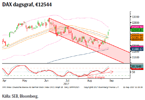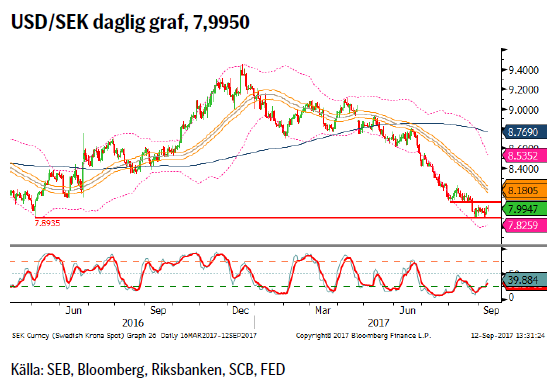 Som väntat lämnade både Riksbanken och ECB oförändrade besked förra veckan. Kommentarerna om en stark euro var dock luddigare än man kunde förväntat sig och intressant nog orkade inte euron klättra nämnvärt på beskedet. Nya sanktioner har införts mot Nordkorea men marknaden har åter skakat av sig oron, en effekt av den tillvänjningseffekt vi pekade på förra veckan. I Norge sitter regeringen kvar efter stortingsvalet sö/må. I Frankrike har vi idag tisdag den första generalstrejken utlyst av facket (dock har Fra bara 8 % anslutningsgrad). Kryptovalutorna har fortsatt att tappa efter fortsatta negativa nyheter från Kina. Då kommer desto positivare tongångar från den Kinesiska bilförsäljningen som ökade med 5,3 % i augusti. Bra för tillväxtutsikterna. Svensk inflation för augusti sjönk tillbaka några tiondelar jämfört med juli (som ju framför allt steg pga. soltörstande svenskars paketresor). På onsdag 0900 CET håller Juncker sitt State of the union-tal.
