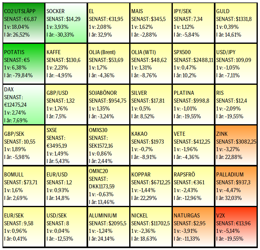 Råvaror: Än så länge så skapar orkanerna i USA ett efterfrågebortfall på bensin (bara i Houstonområdet räknar man med 500.000 förstörda bilar) medan produktionskapaciteten berörts i betydligt mindre grad detta förhållande riskerar att åter öka överutbudet av olja. Priset har dock inte reagerat nämnvärt på detta. Vi får se vad effekten blir av ett förväntat fall på cirka 600k fpd i minskad efterfrågan under september. Industrimetallerna har nu tagit ytterligare steg mot den korrektion som vi under en tid flaggat för, nu även med kopparn ombord. Flera av metallerna drar nu till sig kommersiella försäljningar på termin för 2018 samtidigt som dollarkursen gör ett försök att repa sig. Lägg därtill att den spekulativa marknaden är långa metaller och korta dollar så finns i alla fall förutsättningarna för en korrigering på plats. Jordbävning och stormar har drabbat Mexiko och kaffeområdena hårt men uppgången på Arabicakaffe har dock varit modest. Även det faktum att Arabicakaffet, till skillnad mot Robusta, handlas i ”contango” dvs. näraliggande terminskontrakt är billigare än de längre bort, vilket visar på att marknaden inte räknar med någon näraliggande effekt och prisuppgång. Elpriserna har fortsatt att vara höga och utsläppsrätter har rusat i pris då producenter nu låser in elpris, kol/gas och co2.