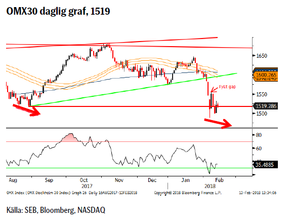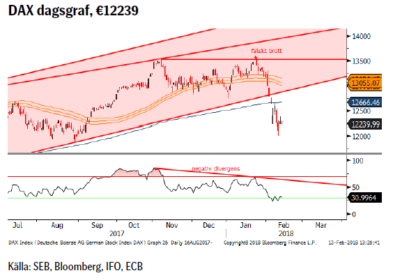 Börsfallet har om inte kommit av sig så åtminstone tagit en paus. Den oroande slutsatsen av de senaste veckorna är att både aktier och obligationer fallit i tandem så denna gång har inte obligationer (eller blandfonder) varit den säkra hamn de oftast brukat vara. Den ökade volatiliteten kommer också att fortsätta tvinga placerare att dra ned på sina exponeringar enligt olika riskmodeller. Om amerikansk löneökningskostnad anges som den primära utlösaren av oron så finns fog för att förvänta sig ytterligare stigande lönepress. En god indikation är att allt fler deltidsanställda får utökad arbetstid. Riksbanken kommer med besked onsdag fm. Ingen ränteförändring kommer nu utan frågan är när? Vår investerarundersökning visar att i september är huvudspåret men till skillnad mot i dec-17 så är det nu betydligt fler som tror att det dröjer inpå 2019. Imorgon onsdag kommer också amerikansk prisstatistik (KPI) för januari. En avvikelse från det förväntade, framför allt på uppsidan kan få oron att snabbt flamma upp igen. Kina börjar på torsdag sitt långa (t.o.m. 21/3) nyårsfirande av hundens år. Se dessutom upp med SDP’s medlemsomröstning om den nya storkoalitionen med CDU/CSU, inte på något vis ett garanterat ja och därigenom en underskattad risk för nyval.