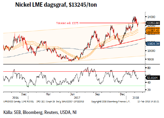 Råvaror: Korrektionen i oljepriset har visat sig bli kraftigare än vad vi initialt trodde. Den nettolånga spekulativa positionen har nu börjat minska men är fortfarande oerhört stor i ett historiskt perspektiv varför ett svagare pris kommer att dra fram mer utbud i form av nedstängning av långa terminer. Guldet har inte svarat speciellt mycket på börsoron men vi kan ju hursomhelst notera att priset är ett av de få som inte fallit nämnvärt. Guld/silver relationen har åter fallerat över 80 (uns silver per uns guld) något som upprepats gång efter gång de senaste decennierna. Palladium/platina spreaden går nu allt fortare ihop, vilket faller sig naturligt tycker vi, givet den kraftigt översålda platinan. Bas-metallerna fortsätter att korrigera lägre och bör fortsätta att göra så. Kakao är tillbaka och testar sitt 55d mv band utbrott. Socker ser ut att ha avslutat en mindre uppåt korrektion och torde alltså vara sårbar för förnyade försäljningar. Elpriserna, både spot (som dock efter köldknäppen fallit tillbaka) och termin har klättrat något högre. Så ock utsläppsrätterna som nu har fördubblats sedan början av 2017