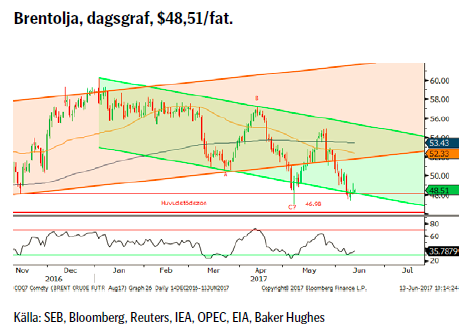 Råvaror: På onsdag kommer IEA’s månadsrapport innehållandes bl.a. OECD lager för april. Förhoppningsvis ska dessa nu ha börjat falla och i sådana fall bör det utgöra stöd åt OPEC’s strategi samt att ge ett stöd åt oljepriset. Koppar har haft en relativt bra vecka och den röda metallen har brutit sin fallande trend sedan början av februari. Den Internationella Koppar Organisationen (ICA) har presenterat en rapport där de räknar med att den ökande efterfrågan på elbilar kommer att leda till att sektorn kommer att niofaldiga sin efterfrågan på koppar fram till 2027. Annars har industrimetaller rent generellt haft ännu en tung vecka, tyngda av fortsatt stigande kinesiska räntor. Elpriset har varit fortsatt relativt högt och återstarten av Ringhals 1, som är avställd för revision, har skjutits upp till den 7:e juli. Frost i vissa kaffeodlingsområden i Brasilien har inrapporterats men skadorna verkar än så länge vara försumbara varför priset är i princip oförändrat men med en ökad risk för att priset kan komma att hoppa upp. Majs, vete och sojabönor har alla fallit tillbaka efter en kortare tids uppgång.
