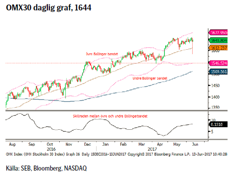 Det Brittiska valet blev en riktig rysare och vilka politiska förändringar som det kommer att leda till vet vi i skrivande stund inte. Sannolikt har det minskat risken för ett hårt utträde. Viktigt är nu att förhandlingar kommer igång så fort som möjligt. Det franska valet gick bättre för Macron än vad undertecknad spekulerat i och som det ser ut så kommer Macron nu att kunna erhålla en majoritet i Nationalförsamlingen, slutresultatet kommer efter söndagens andra omgång. Imorgon onsdag kommer Federal Reserve med sitt räntebesked och marknaden har prisat in en höjning med 0,25 %. Vad som kommer att sägas om kommande höjningar och planen för att börja avveckla den stora balansräkningen är det som bör dra till sig det största intresset. Frågan är om marknaden är för försiktig avseende amerikansk ekonomi då det bara prisas in en höjning till det kommande året. ECB levererade i enlighet med våra tankar då man ändrade texten till balanserade tillväxtrisker men å andra sidan justerade ned inflationsprognosen vilket pekar mot en än längre tid med ultralåga räntor.