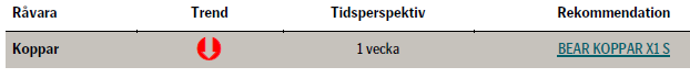 Vi tror dock att effekten är överdriven: Med största sannolikhet kommer priset att rekylera nedåt och även om vi kanske ser nya stödnivåer, åtminstone för zinkpriset, så lär vi se rörelser nedåt. Kanske inte under nästa vecka då investerare sannolikt kommer att påverkas av vad som sägs i London – dessutom kommer handeln på grund av att så många är där vara relativt slagig – men sannolikt efteråt. Vi tror fortfarande att priset på koppar skall ned och nu gäller det att ha is i magen. Vår bear-rekommendation initierades med facit i hand för tidigt, men vi ligger kvar i den och väntar in lägre nivåer. För den som är snabb i vändningarna kan en god strategi vara att köpa bear-certifikat på koppar med högre hävstång när rekylen nedåt kommer.