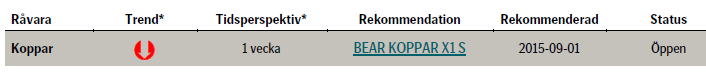 Vi tror dock att effekten är överdriven: Med största sannolikhet kommer priset att rekylera nedåt och även om vi kanske ser nya stödnivåer, åtminstone för zinkpriset, så lär vi se rörelser nedåt. Kanske inte under nästa vecka då investerare sannolikt kommer att påverkas av vad som sägs i London – dessutom kommer handeln på grund av att så många är där vara relativt slagig – men sannolikt efteråt. Vi tror fortfarande att priset på koppar skall ned och nu gäller det att ha is i magen. Vår bear-rekommendation initierades med facit i hand för tidigt, men vi ligger kvar i den och väntar in lägre nivåer. För den som är snabb i vändningarna kan en god strategi vara att köpa bear-certifikat på koppar med högre hävstång när rekylen nedåt kommer.