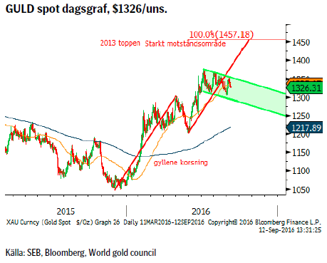 Guldet har sedan förra veckan ännu en gång testat den övre delen av den möjliga ”tjurflaggan” och ännu en gång förvägrats bryta upp ur densamma. Svagare amerikansk data och därmed uppskjuten räntehöjning sänkte dollarn och tryckte ned guldpriset men bara kortsiktigt. Guldet ser för närvarande ut att handlas ned på sämre riskaptit och stigande räntor alltså som vilken riskfylld placering som helst.