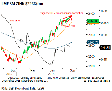 Så kom den då till slut, vändningen, korrektionen. Vi har under en tid ett flertal gånger påpekat att zinkmarknaden sprungit ifrån sig själv och att en korrektion med all nödvändighet väntat runt hörnet. Med stigande lager och en tekniskt allt mer ”stretchad” vy så har vi till slut nått en punkt där marknaden nu börjat skydda produktion/ta hem vinst på långa positioner. Givet den mycket långa nettopositionen bland kapitalförvaltare så kan en nedgång utlösa betydande försäljningar av finansiella positioner.