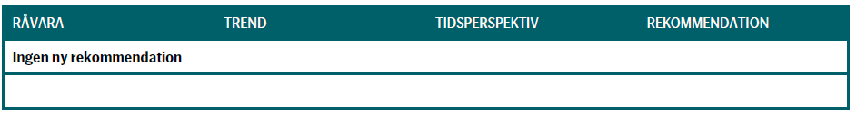 Råvaror: Oljeprisuppgången bör nu åtminstone kortsiktigt ha nått vägs ände efter att ha vänt ned från sitt kanaltak. Ädelmetaller fortsätter att utvecklas positivt och med sämre riskaptit den närmaste tiden bör de kunna fortsätta att göra så. Flertalet jordbruksprodukter handlas högre och med en fast underton. Koppar fortsätter att vara en svag presterare jämfört med t.ex. aluminium. Zink tycker vi fortfarande är lite för dyrt just nu.