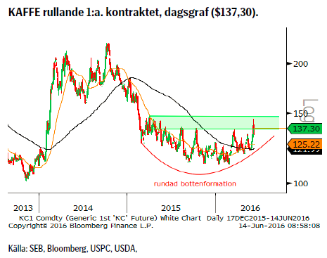 Egentligen är det förvånande att inte priset lyckats ta sig upp ur bottenformationen givet hur mycket dåliga nyheter som drabbat kaffemarknaden under våren. Frågan är hur mycket som finns undanstoppat i så kallade dolda lager? Dessutom så finns det förhoppningar om bättre utsikter i Brasilien senare i år i alla fall om man ska tro på den amerikanska jordbruksmyndigheten USDA.