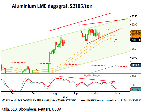 Så då är den då här, korrektionen. Trots att det nu bara är en dag kvar till den officiella uppvärmningssäsongen (15/11- 15/3) så har marknaden den senaste veckan handlat ned aluminiumpriset. Håll ögonen på hur smogen utvecklar sig i framför allt nordöstra Kina http://aqicn.org/map/world/#@g/2.882/66.6211/2z då allt för höga partikelhalter riskerar att skapa prisspikar. Dock så länge vi inte ser påtvingade neddragningar kvarstår fortsatt korrektionsrisk på nedsidan.