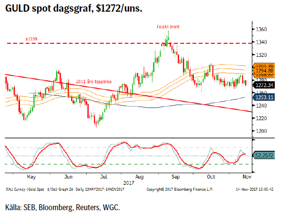 Råvaror: Oljeprisuppgången har sedan förra veckan tagit en paus men fortsatt geopolitisk oro (Saudiarabien, Iran, Venezuela) bör se till att vi håller oss kvar på en relativt hög nivå eller till och med orkar ta oss upp på nytt årshögsta. Dock vill vi höja en varningsflagga då vi har OPEC mötet den 30/11 och skulle det inte komma ut något om en förlängning av innevarande produktionsbegränsningar (som förfaller 31/3) så finns helt klart en risk besvikelse och ett prisfall. Ett lägre pris bör också komma som ett brev på posten om den geopolitiska situationen lättar något. OPEC har även höjt sin prognos för amerikansk skifferoljeproduktion nästa år och med 18-månaders terminen nu vid $53/54 så bör också vi se en ökande aktivitet i framför allt Permian. De stigande WTI priserna ser nu ut att locka till förnyade borrningar då antalet riggar förra veckan åter ökade. Metallerna har haft det lite motigt den senaste veckan men den allmänt lite svagare riskaptitet bör fortsätta lägga ett lock på för kommande vecka/veckor. Håll ett öga på aluminium då den 15/11 markerar starten för den kinesiska uppvärmningssäsongen och därmed möjligheten att stänga ned produktion med tvång om luftkvaliteten blir för dålig. S&P höjer vikten för energi (och sänker jordbruksprodukter) i sitt S&P GSCI råvaruindex för 2018. Utsläppsrätterna föll efter den senaste EU överenskommelsen som ansågs något mjuk. Elpriserna, framför allt på kontintenten, har stigit givet det kallare än normalt vädret. Kakao har brutit upp över sitt 55v mv band.